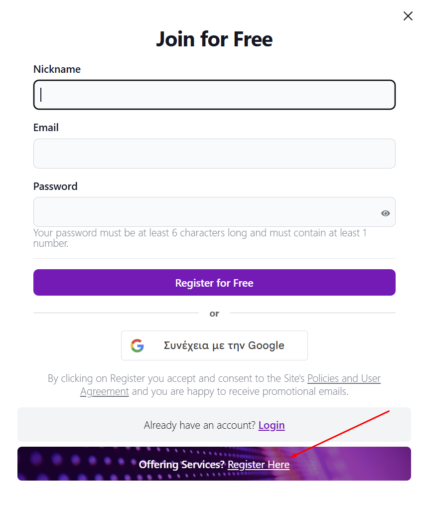 A pop-up window titled Join for Free will appear. Click on Register Here at the bottom of this pop-up, where it says “Offering Services? Register Here”.
