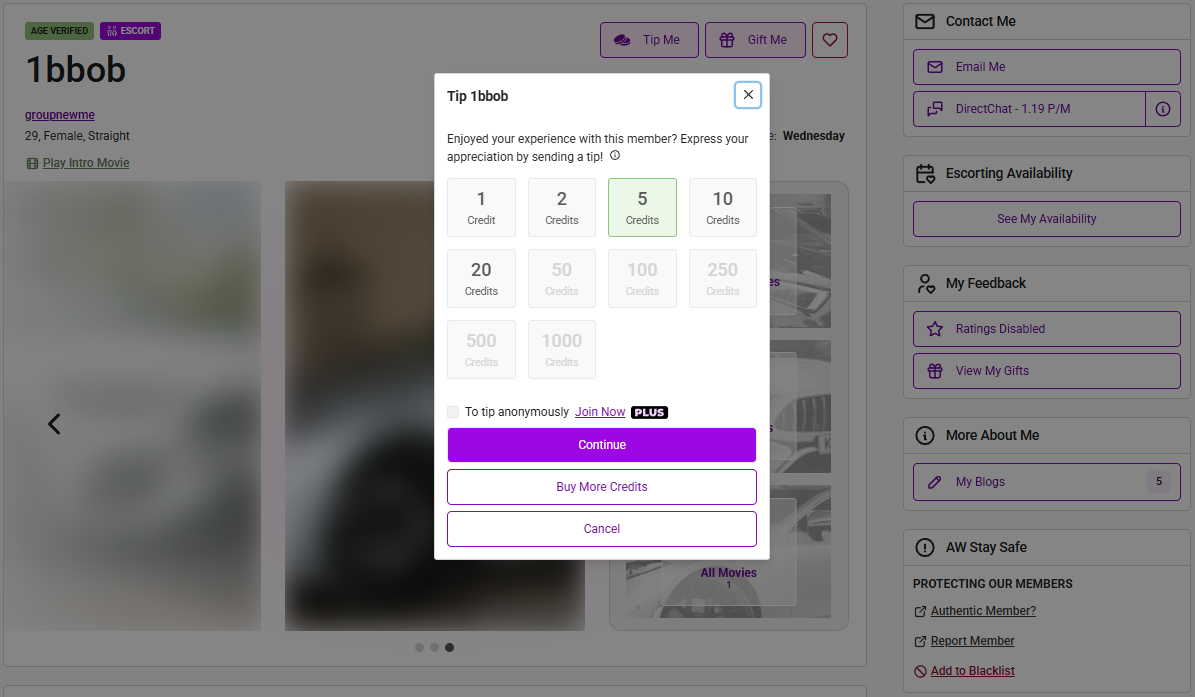 - Once a member clicks on "Tip Me", a window will pop up for the member to choose the amount to tip.