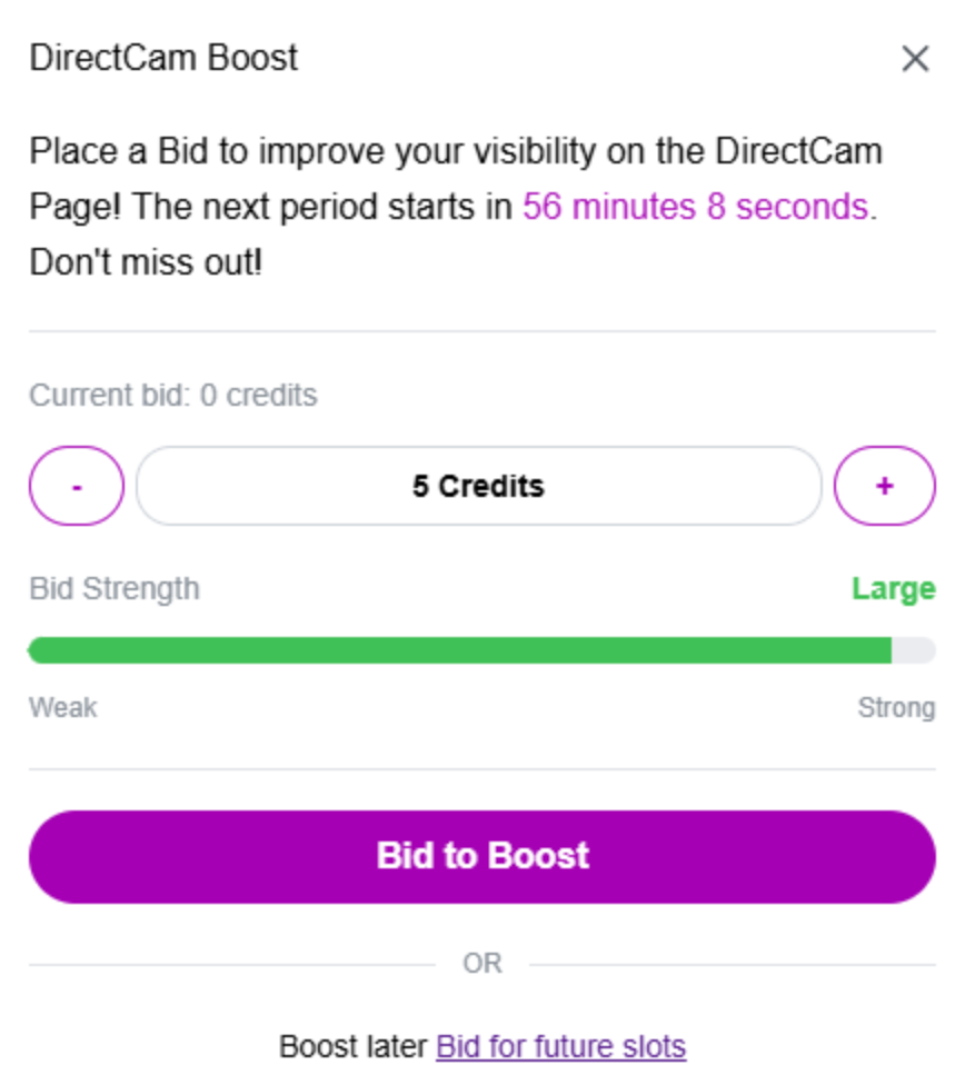 The DirectCam Boost button lets you bid to improve your profile's position on the DirectCams listing pages.