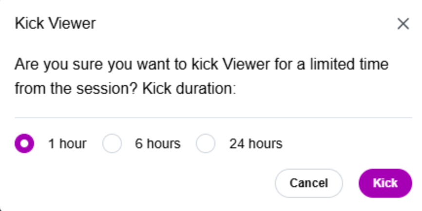 Kicking temporarily removes a viewer from the stream and blocks re-entry for a selected time of 1 hour, 6 hours, or 24 hours.